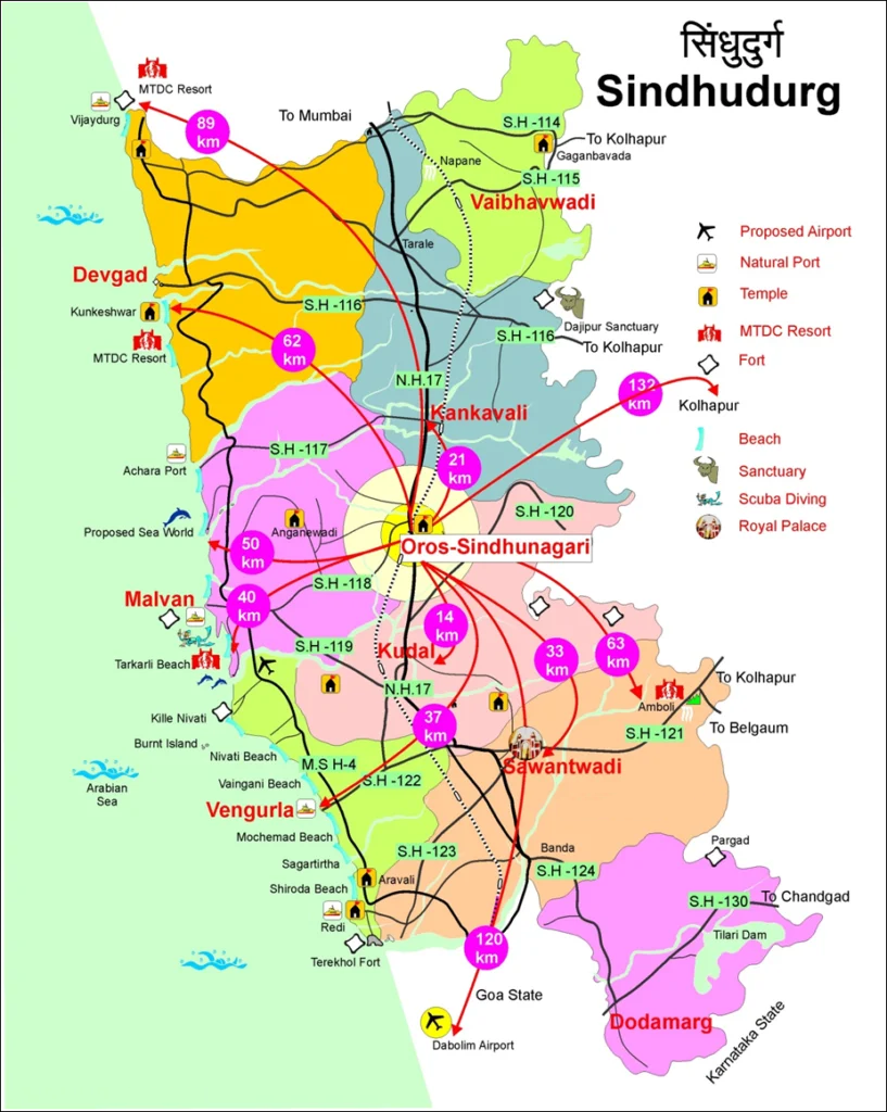 Connectivity : Sindhudurg is well-connected by road and rail. The Konkan Railway line passes through the district, and the nearest airport is the Goa International Airport, approximately 100 kilometers away.
