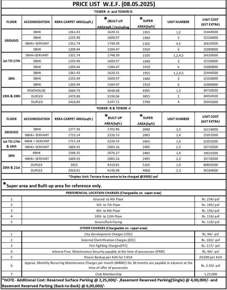 | Unit Type | Approx Super Built-up/Saleable Area | Typical Price Range | Notes |