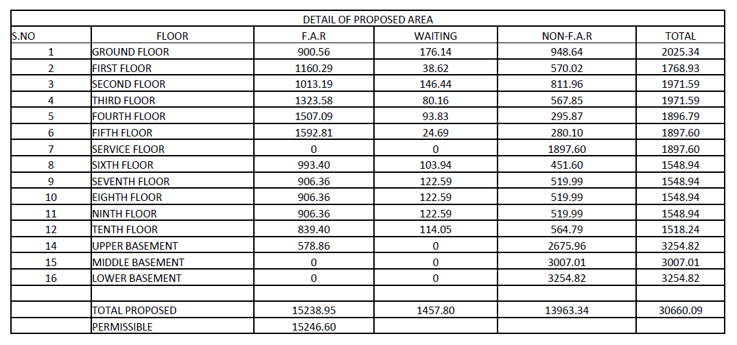 - Permissible F.A.R @ 300 = 15246.60 sqm